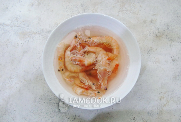 Варено-мороженые креветки залейте кипятком и держите в нем 10 минут. После промойте в холодной воде и удалите голову, панцирь и кишечную вену.