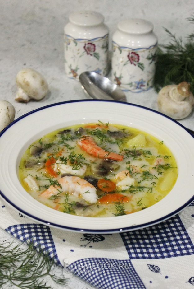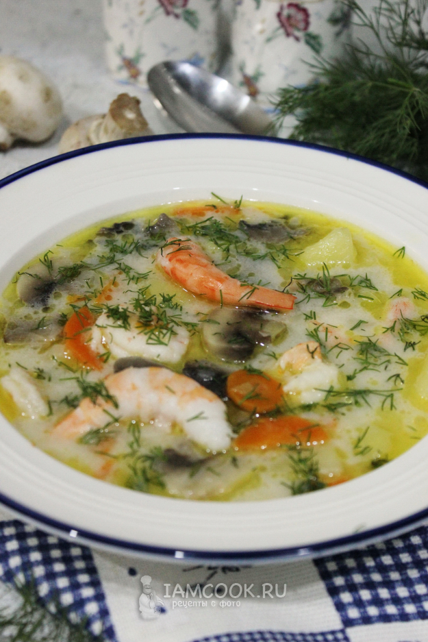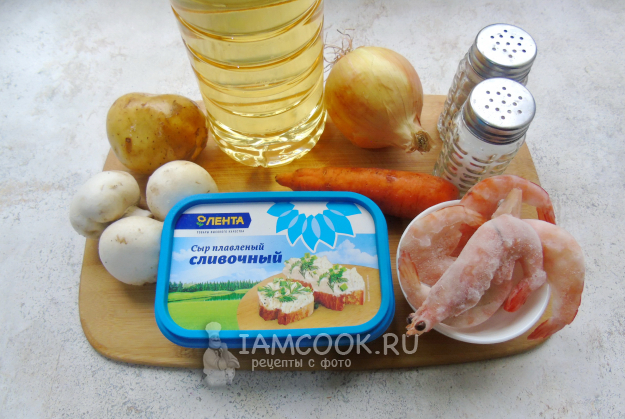 Соберите ингредиенты для приготовления сырного супа с креветками и грибами (шампиньонами).