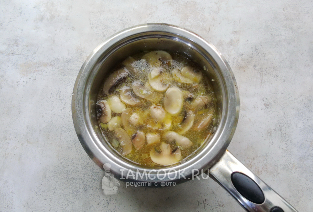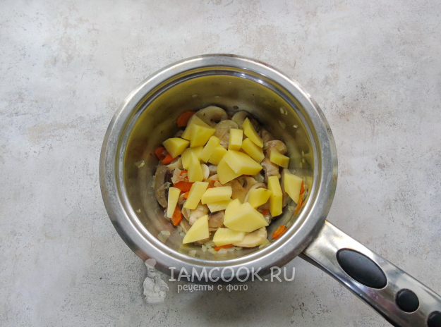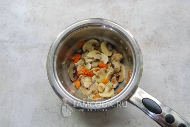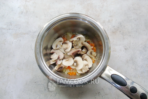 Шампиньоны очистите, помойте и нарежьте. Добавьте в кастрюлю с луком и морковью.