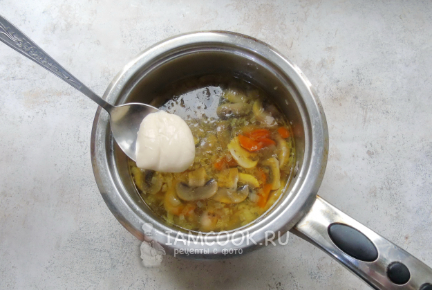 Затем добавьте плавленый сыр. Я взяла мягкий, сливочный, который быстро растворяется в горячем супе. Можно взять обычный плавленый в брусочках, но он гораздо дольше будет растворяться.