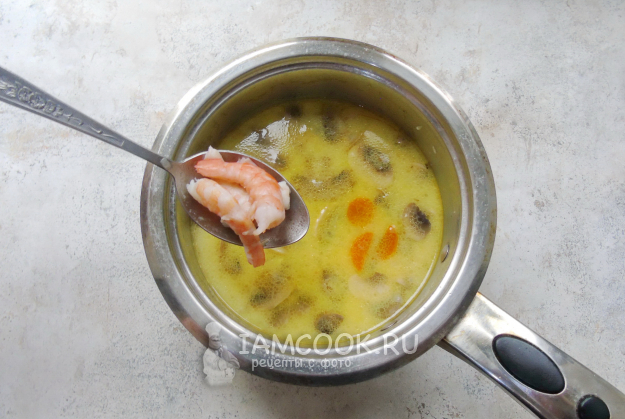 Обработанные креветки добавьте в кипящий суп и через 2-3 минуты выключайте плиту.