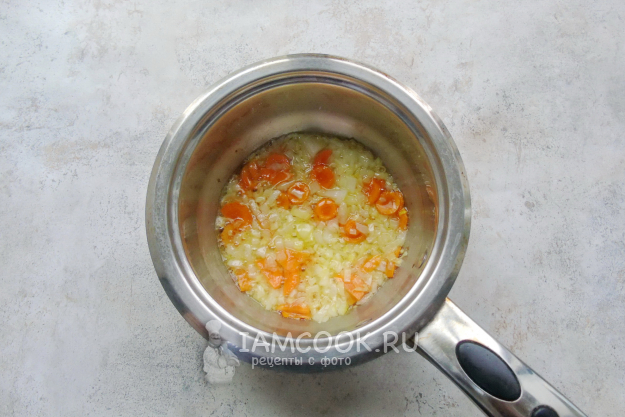 Лук и морковь нарежьте. Выложите в кастрюлю с толстым дном. Налейте растительное масло и жарьте овощи до прозрачности лука.