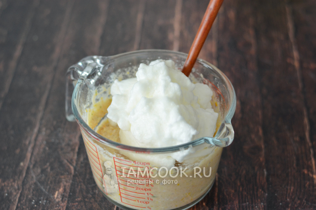 Аккуратно вмешайте белки в общую массу лопаточкой, стараясь не потерять их воздушность.