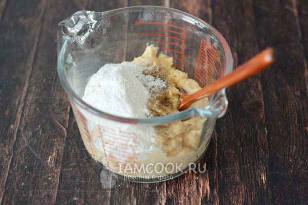 Переложите получившуюся массу в миску, добавьте соль, перец и рисовую муку. Тщательно всё смешайте.