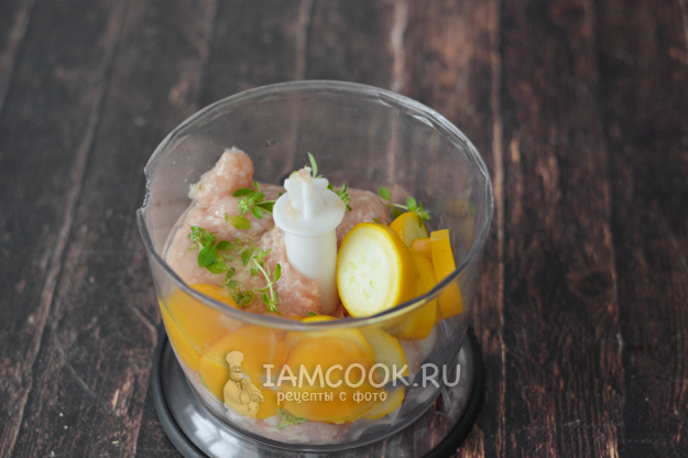 В чашу блендера положите куриный фарш, нарезанные произвольно кабачок и лук. Добавьте сырые яичные желтки и щепотку листиков свежего тимьяна (либо используйте сухой тимьян).
