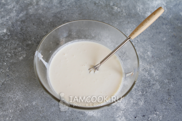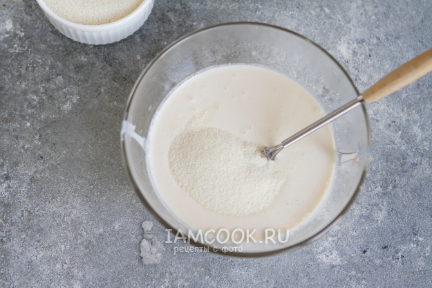Ввести манную крупу. Смесь получается жидкой, чуть гуще, чем на блины. Оставляем ее на столе на 5-10 минут. За это время манка немного набухнет.