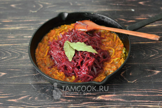 Теперь добавьте в борщевую заправку квашеную свеклу, чуть обжарьте её вместе с другими овощами, 3-5 минут. Сюда же можете сразу добавить лавровый лист.
