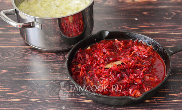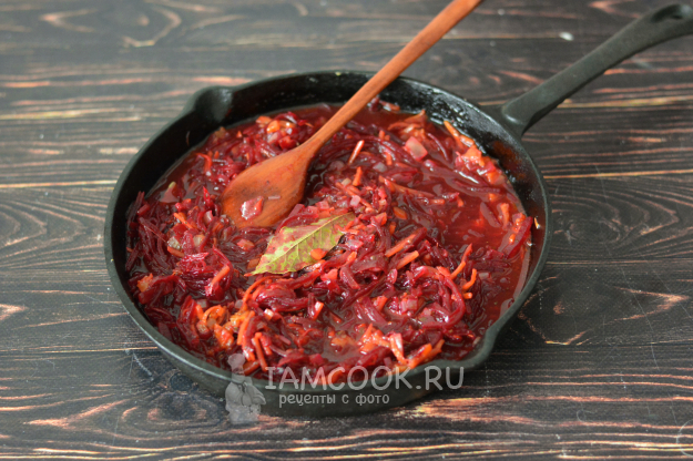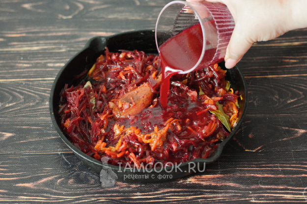 Влейте в сковороду рассол от квашеной свеклы, накройте сковороду крышкой и тушите борщевую заправку около 20-30 минут на тихом огне. Для сохранения цвета свеклы можно добавить в заправку немного лимонной кислоты по желанию.