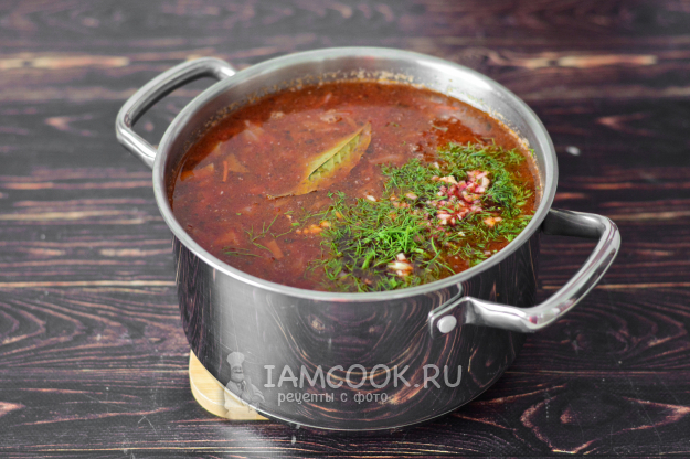 Как только после добавления чеснока и укропа вы увидели первый "бульк", выключите плиту и дайте борщу настояться под крышкой полчасика.