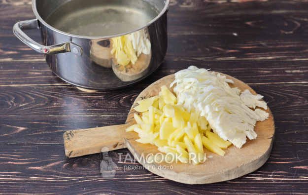 Нарежьте соломкой капусту и картошку. Доведите до кипения бульон и положите в него картошку и капусту. Варите на среднем огне примерно 10-15 минут.