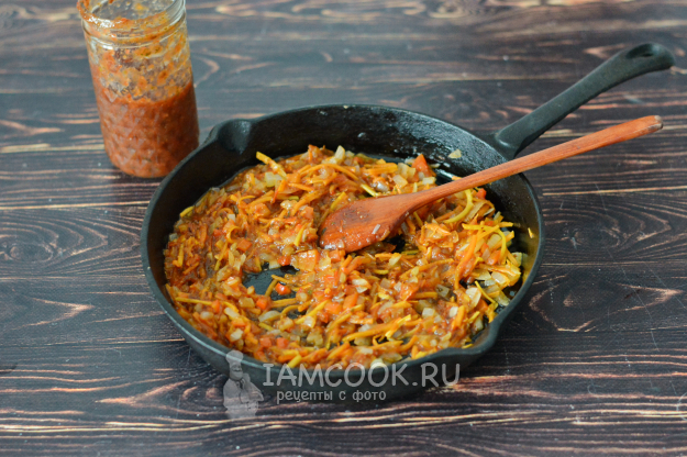 Обжарьте на среднем огне лук, морковь и перец примерно 7-10 минут, до золотистого цвета. Затем добавьте томатный соус и перемешайте.