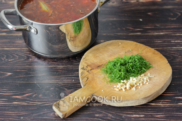 В самом конце добавьте сахар, соль по вкусу, нарубленный чеснок и укроп. Специи я не кладу, так как у меня очень пряный томатный соус, но если вместо него вы использовали томатную пасту, то добавьте в борщ специи на свое усмотрение.
