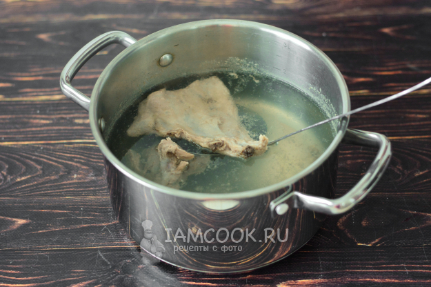 Первым делом необходимо сварить мясной бульон. Для этого мясо ополосните, положите в кастрюлю и залейте холодной водой. Поставьте на плиту и доведите до кипения. Всю образовавшуюся пену снимите ложкой. Как только пена перестанет образовываться, сделайте огонь под кастрюлей самый минимальный, добавьте примерно половину нормы соли и варите бульон примерно час-полтора, пока мясо не начнет отделяться от косточек. Если будете варить борщ с говядиной, то она варится немного дольше по времени, чем свинина (от 2 до 3 часов).