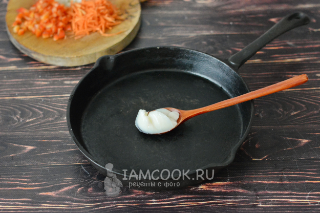 В сковороде нагрейте ложку свиного жира (или растительного масла).