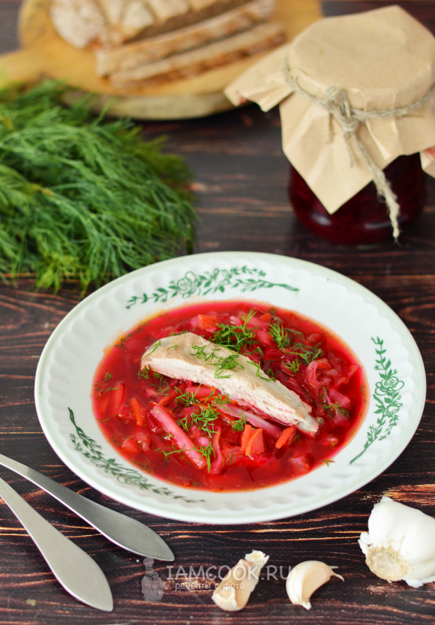 У меня свежая квашеная свекла, ей всего пара недель. Имейте в виду, что квашеная свекла в процессе хранения может стать более светлой, поэтому цвет у борща также будет посветлее.