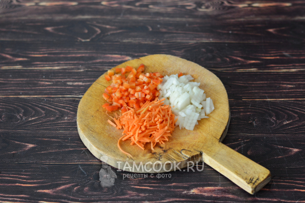 Для этого лук и перец нарежьте мелким кубиком, а морковь - тонкой соломкой (или натрите на тёрке).