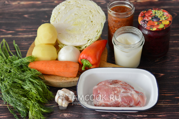 Соберите все необходимые продукты для приготовления борща с квашеной свеклой на свинине.