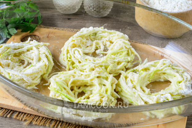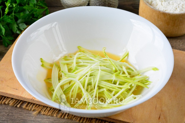 Вбейте в глубокую посуду куриное яйцо, взболтайте его вилочкой. Теперь партиями туда окунайте кабачковую стружку.