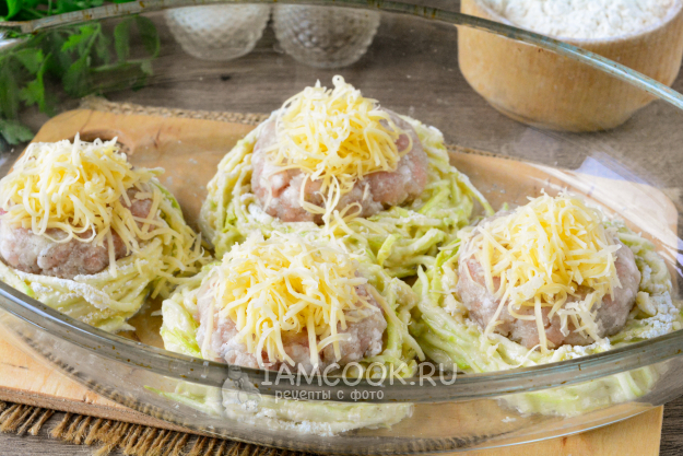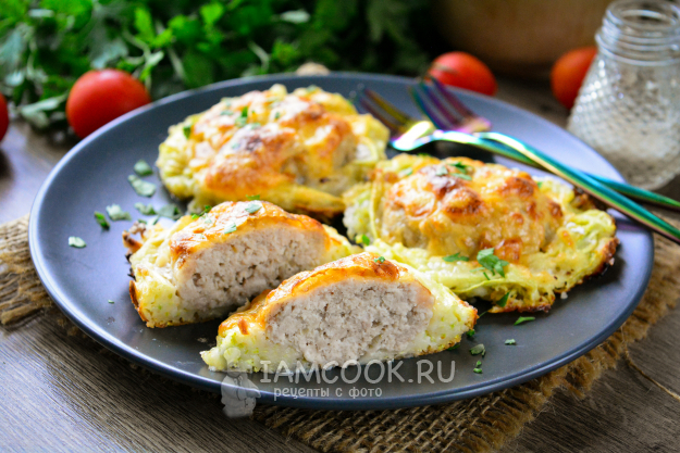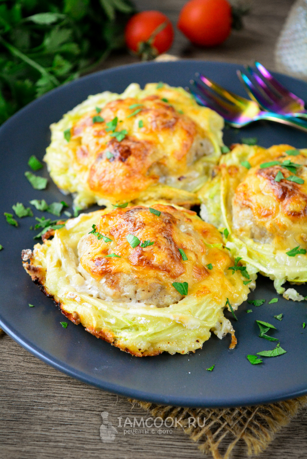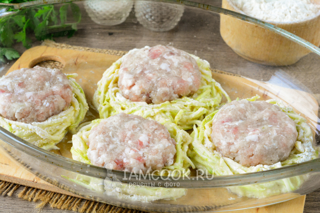 В середину каждого гнезда выложите фарш, предварительно его слепите как котлеты.