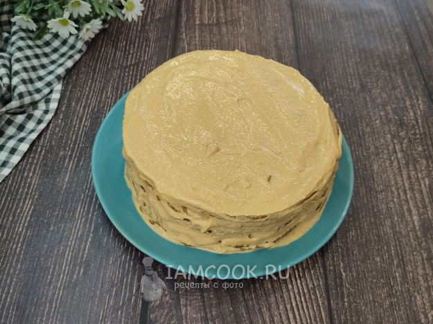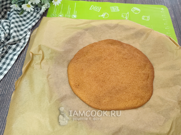 Выпекаем коржи в разогретой до 180 градусов духовке минут 5-7, ориентируйтесь на мощность своей духовки и цвет коржа, он должен стать слегка коричневым. Переверните бумагу с коржом, аккуратно отделите корж от пергамента, отложите, пусть остынет, только не складывайте готовые коржи друг на друга - могут слипнуться. Таким образом выпекаем все коржи, у меня получилось ровно 6 штук.