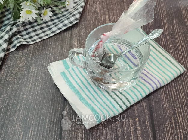 Украсим его немного (вы можете украсить по своему вкусу или оставить как есть). Шоколад помещаем в кондитерский мешок, завязываем, кладем в чашку, заливаем кипятком. Через 1-2 минуты он растает.
