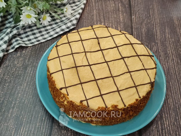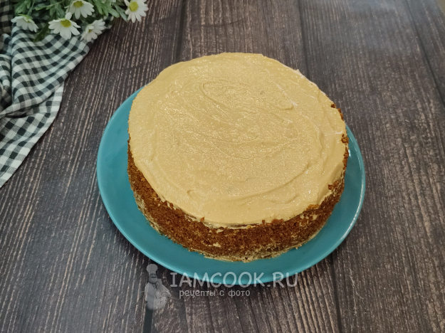 Коржи подровняйте ножом, крошку оставьте для обсыпки. Собираем торт. На дно блюда нанесите немного крема, чтобы закрепить нижний корж.
