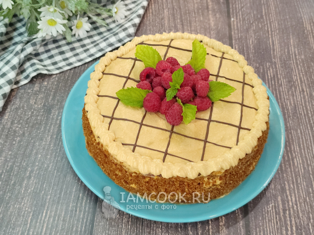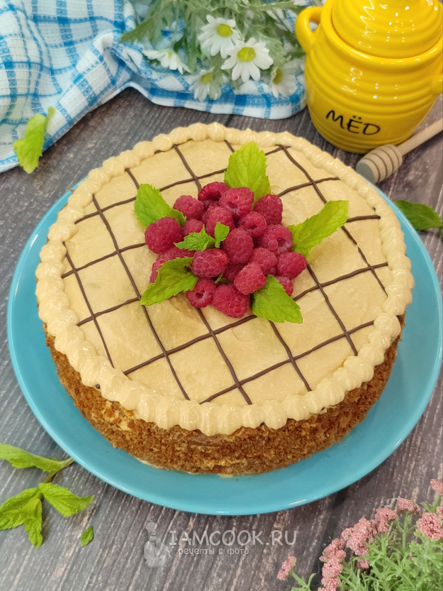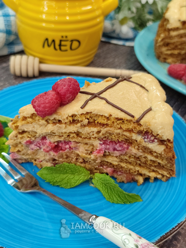 В центр выложим горсть малины, добавим несколько листочков мяты. И наш медовик с малиной готов!