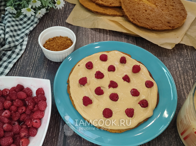 Накрываем следующим коржом, повторяем слой крема, ягоды малины. И так до последнего коржа. Его оставляем просто с кремом, без ягод. Бока также обмазываем кремом.