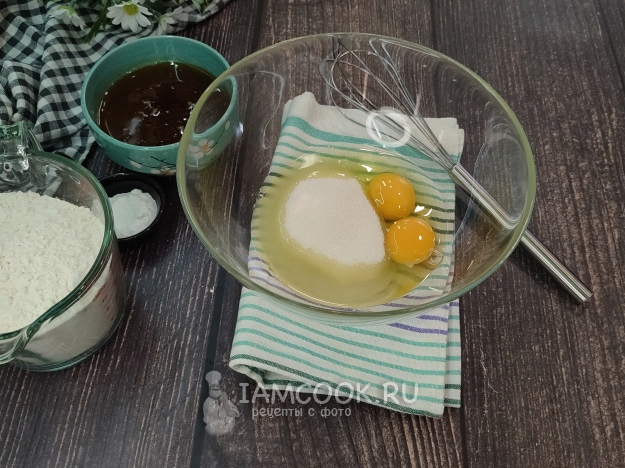 В глубокой миске тщательно перемешайте яйца и сахар, не надо взбивать, достаточно простого перемешивания.