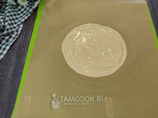 Торт можно делать любой формы, я сегодня решила приготовить круглый, диаметром 20 см. Для этого на коврик для выпечки кладу пергамент, через который отчетливо видно нарисованный круг с нужным диаметром. Если коврика такого нет, можно нарисовать ручкой окружность нужного размера прямо на пергаменте, затем перевернуть его и наносить тесто по контуру. Кладу на пергамент 2 ст. л. теста и равномерно распределяю ложкой. Пергамент, конечно же, должен быть качественным.