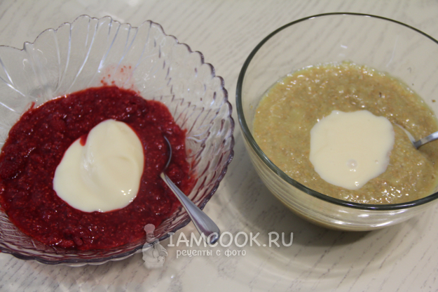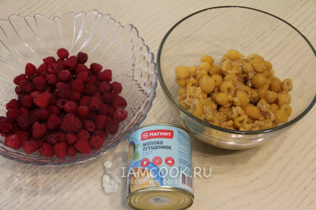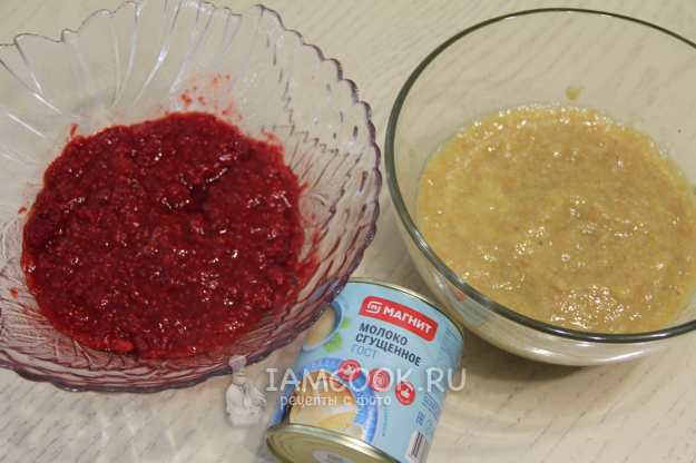 Добавить сгущенку в миску к малине.
