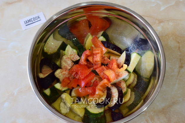 В конце приготовления снимите фольгу и посыпьте овощи тертым сыром. На горячих овощах он сразу начнет плавиться. Оставьте овощи под сыром в духовке еще на 2-3 минуты.