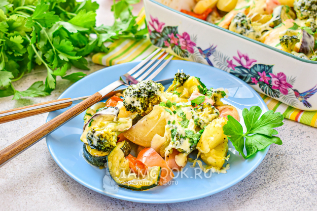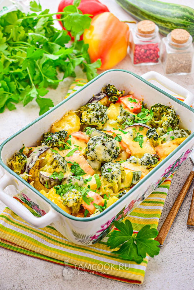 Готовые овощи под сыром извлеките из духовки и сразу подавайте к столу.
