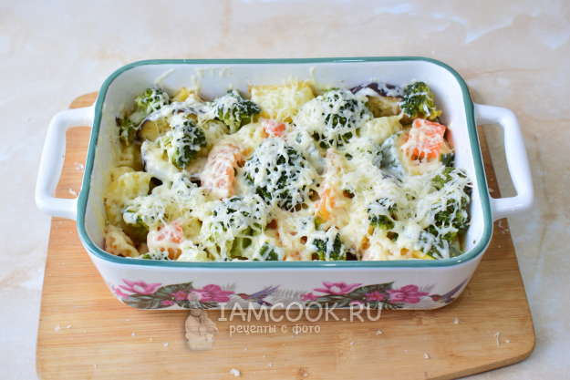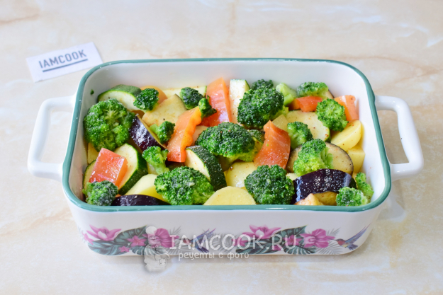 Подготовленные овощи выложите в форму для запекания. Сверху разложите брокколи. Влейте в форму немного воды.