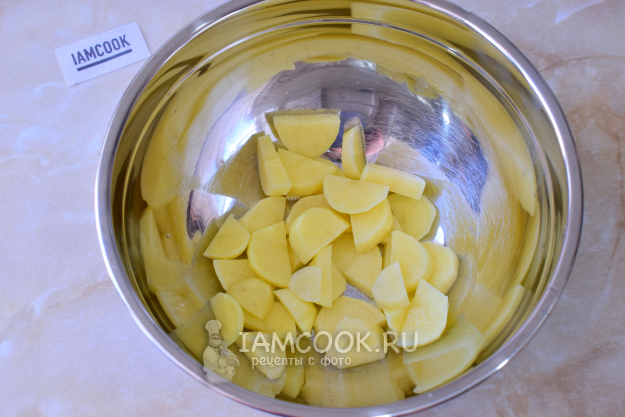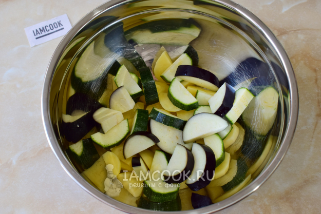 Следом нарежьте на кусочки кабачок и баклажан. Добавьте к картофелю.