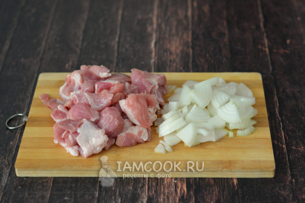 Нарежьте свинину на небольшие кусочки, а лук - четверть-кольцами.