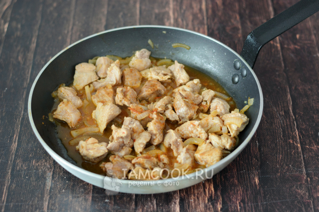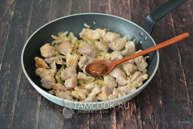 Как только лук начнет подрумяниваться, убавьте огонь и добавьте к свинине аджику по вкусу.