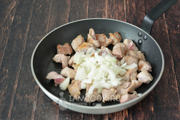 Добавьте к свинине нарезанный лук и обжарьте их вместе около 7-8 минут.