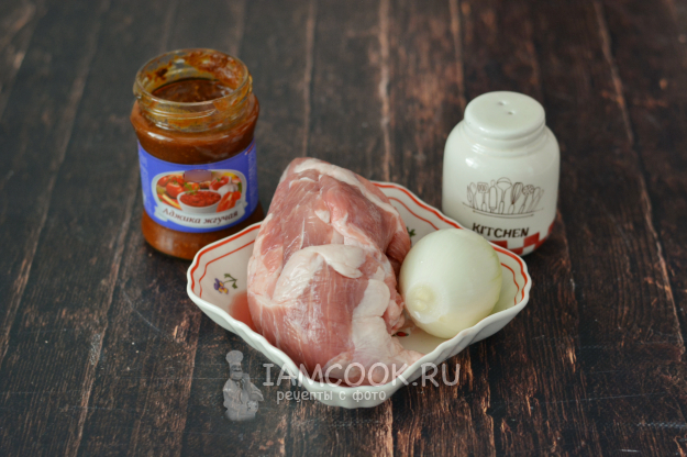 Вот тот небольшой набор продуктов, который понадобится для приготовления свинины с аджикой на сковороде.