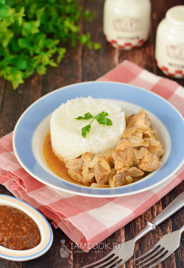 Свинина с аджикой на сковороде готова. Она пряная, островатая и очень ароматная. К такому мясу нужен абсолютно нейтральный и неяркий гарнир, поэтому я просто отварила белый рис.