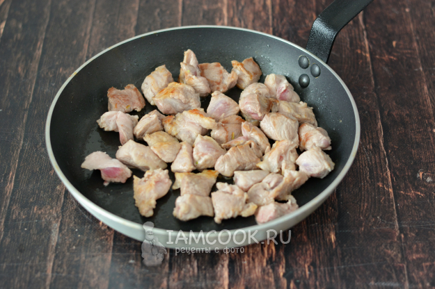 Разогрейте хорошо сковороду. На разогретую сковороду выложите кусочки свинины и обжарьте их до лёгкого румяного цвета.