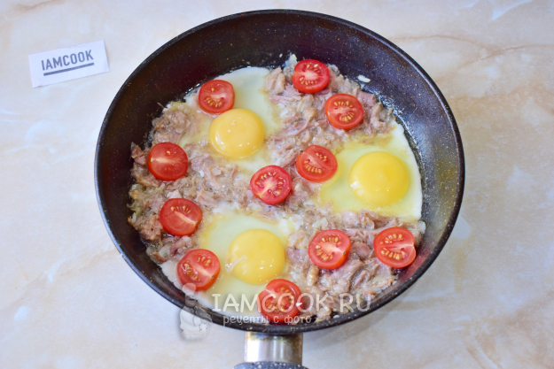 Разбейте в сковороду яйца и выложите нарезанные черри. По вкусу добавьте соль и специи. Готовьте тушенку с яйцами на сковороде на небольшом огне 1-2 минуты. Можно накрыть сковороду крышкой.