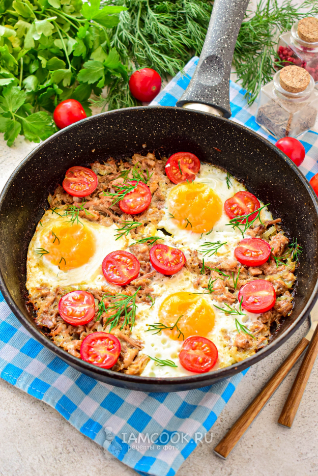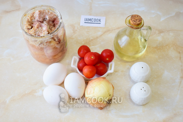 Чтобы приготовить тушенку с яйцами на сковороде, соберите все необходимые ингредиенты по списку. Тушенку можно взять из любого вида мяса. Я буду готовить из свиной тушенки. Помидоры могут быть любые, у меня черри.
