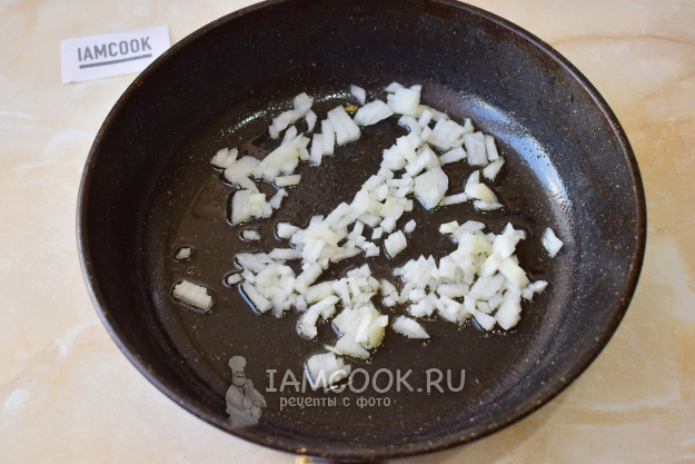 Лук очистите от шелухи и ополосните холодной водой. Затем его мелко нарежьте. На горячую сковороду налейте немного растительного масла и выложите нарезанный лук. Обжарьте его в течение минуты до прозрачности.