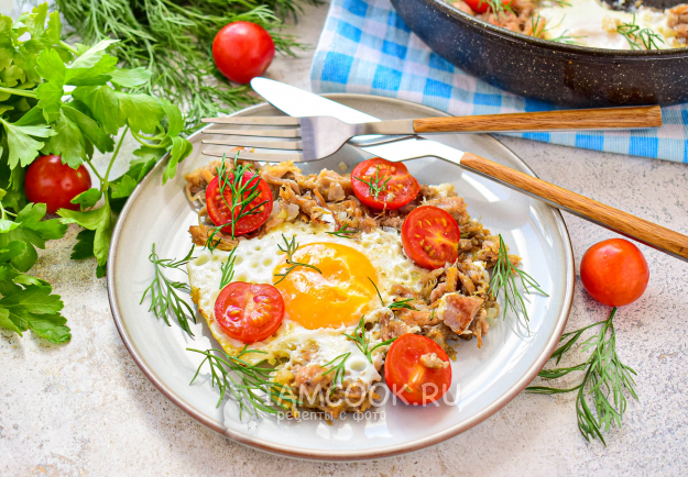 Готовую яичницу разложите по тарелкам и сразу подавайте к столу.