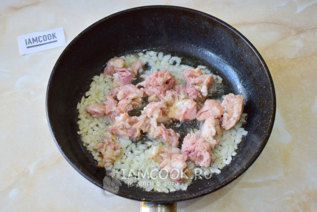 Затем выложите в сковороду тушенку. Прогрейте её, чтобы она равномерно смешалась с луком.