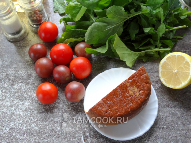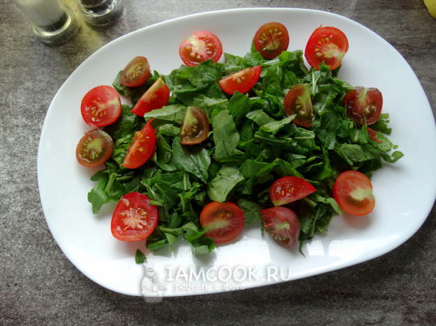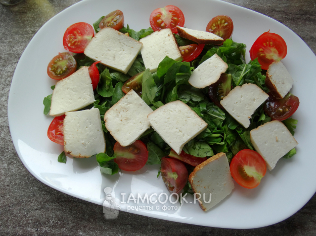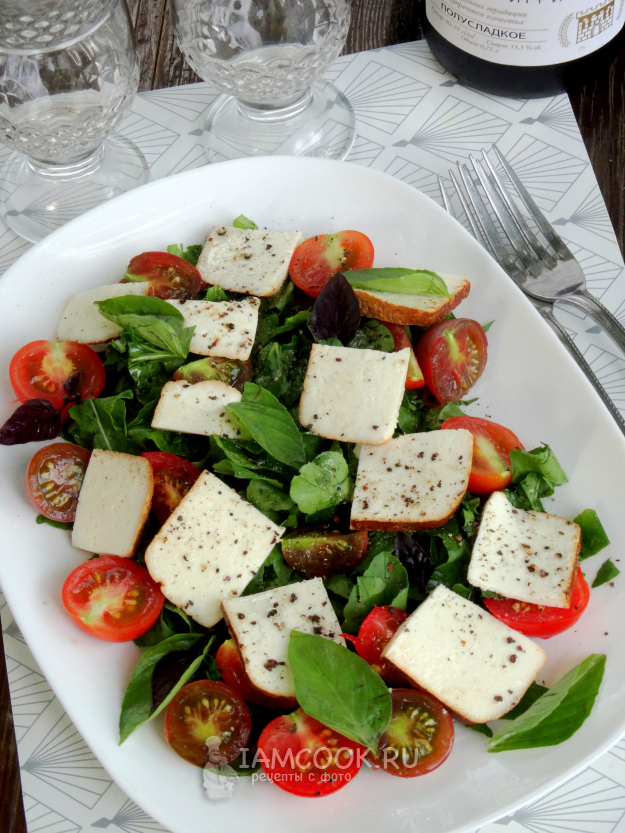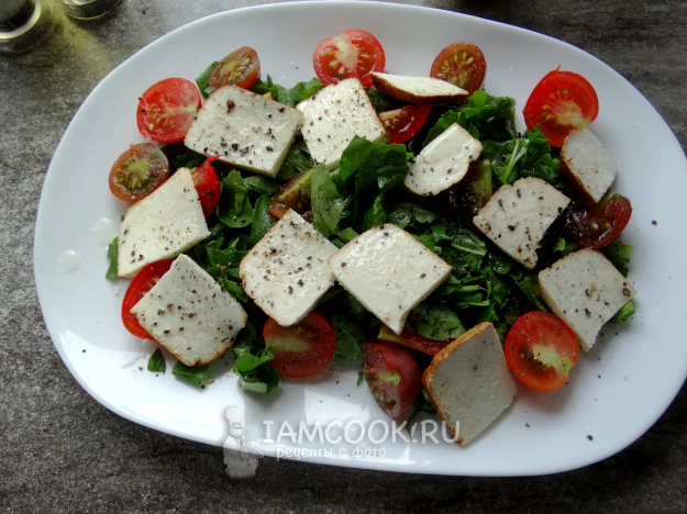 Для салата понадобится копченый адыгейский сыр, его можно купить в магазине (но надо поискать) или же закоптить самостоятельно по этому рецепту. Сочетание руколы и помидоров многим знакомо, а если дополнить этот дуэт сыром с копченым вкусом, то случится новое гастрономическое открытие. Такой лёгкий салат можно приготовить на обед или же подать гостям на мероприятии в качестве закуски. Добавьте в салат пару листиков свежего базилика, и вы очутитесь в солнечной Италии.