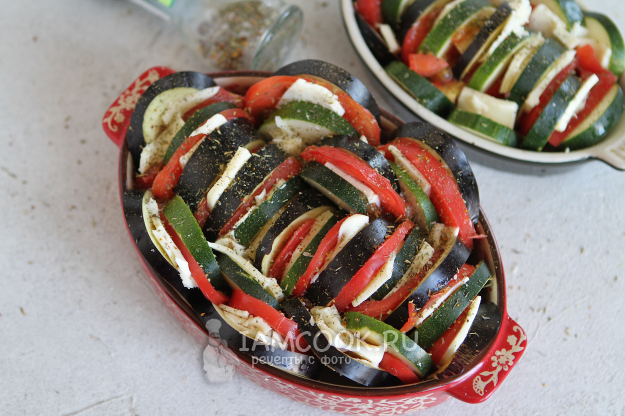 Присыпать овощи солью с прованскими травами. Обращаю ваше внимание, цукини и баклажан я не солила. Сыр моцарелла по вкусу пресный, не соленый. Поэтому специи и соль добавляйте по своему вкусу.