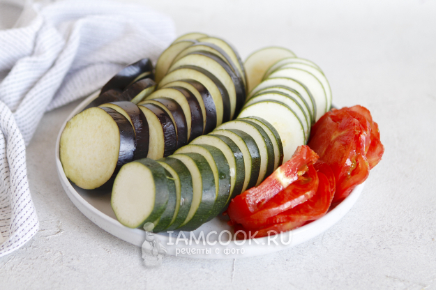 Овощи: цукини, баклажан и помидоры помыть и обсушить, нарезать кружочками.