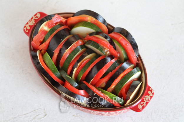 Форму для запекания, желательно с высокими бортиками, смазать маслом. Уложить в неё овощи.